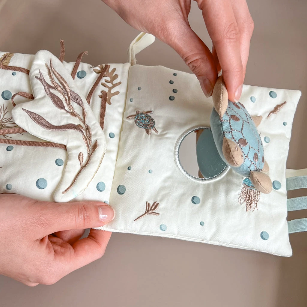 The sweetest Activity Book with delicate embroidery and applications of beautiful underwater elements inspired by our serene Sea Garden print.