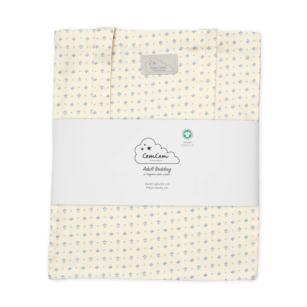This Adult bedding set includes a duvet cover 140x200cm and a pillow case 60×65 cm and comes in a matching fabric bag. Bedding in white and blue shades.