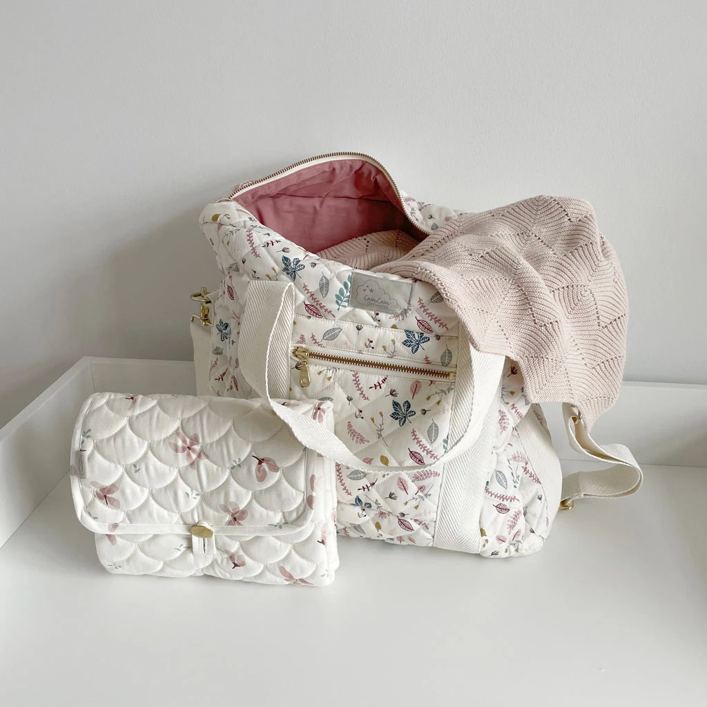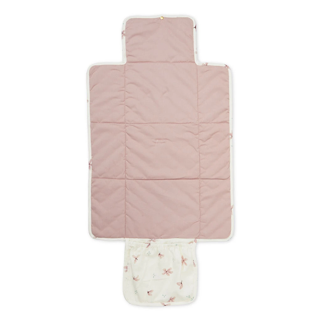 The mat is easily folded with one hand to a handy small size, that fits into the nursery/diaper bag. It has a practical pocket inside that fits a diaper and a muslin.