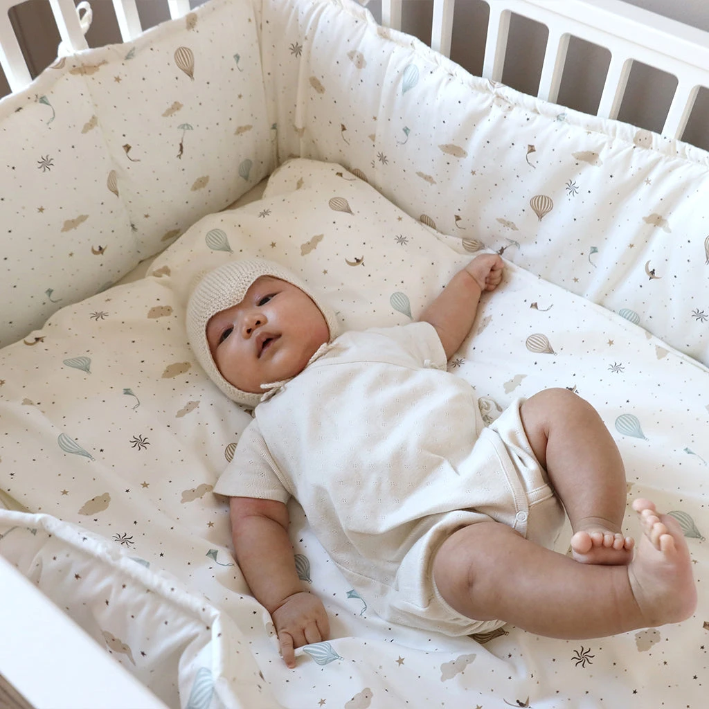 Soft, organic Cot bumper/cot bumper with soft filling inside to provide comfort, safety and calmness for your baby while sleeping. The cot bumper fits a standard baby cot of 120x60cm.