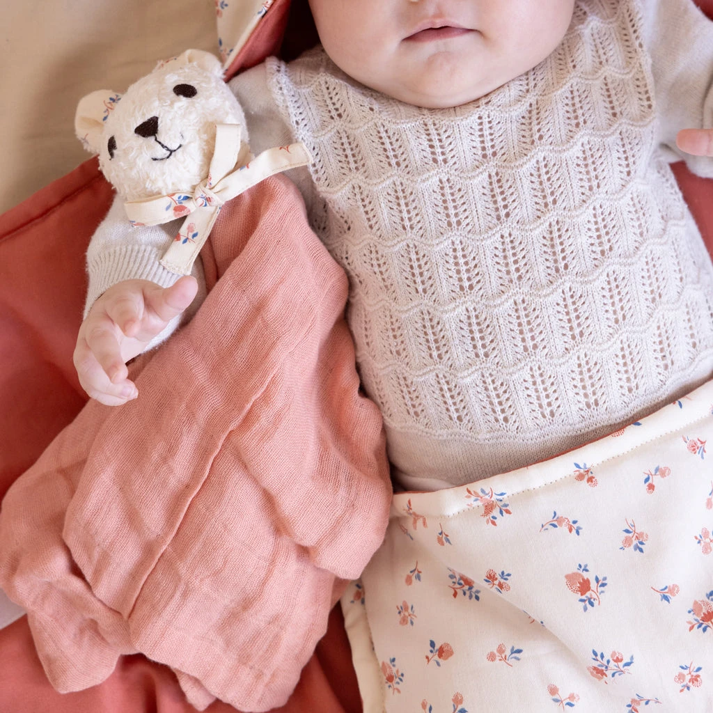 Soft cuddle cloth in organic muslin fabric with an adorable teddy bear.