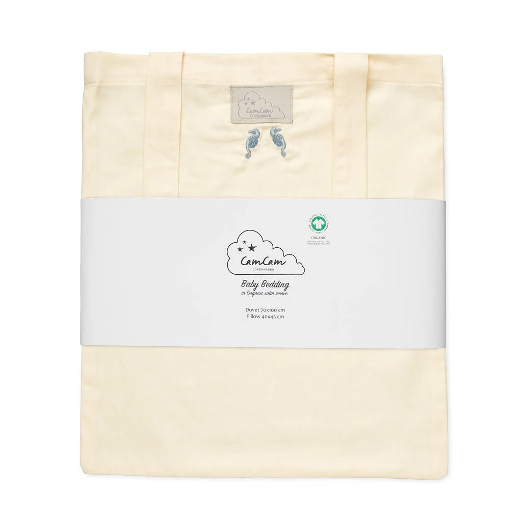 Made from GOTS-certified organic cotton, this exclusive bedding features delicate embroidery of beautiful sea horses guaranteed to bring harmonious grace to the nursery and tender dreams to your baby.