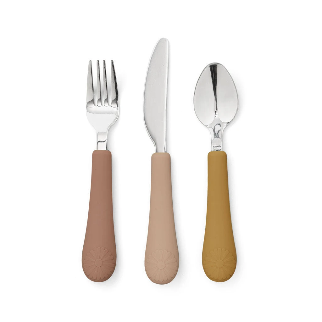 Beautiful and practical kids cutlery set designed with a beautiful flower embellishment allowing toddlers and young kids to dine in style and with confidence.