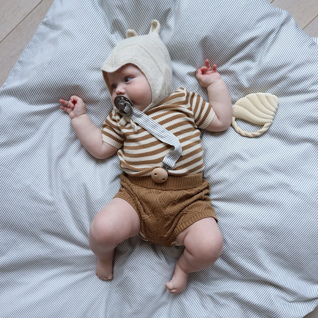 The pacifier holder has a strong 100% natural rubber ring, interfacing inside to avoid twisting and a smart wooden clip with nickel-free metal to attach the holder to the child’s clothing.