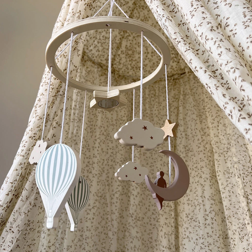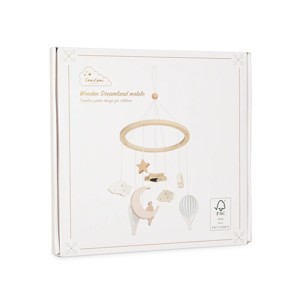 Sweet and poetic Wooden Dreamland Mobile featuring cute little hot air balloons and clouds which are classical elements from the Cam Cam universe.